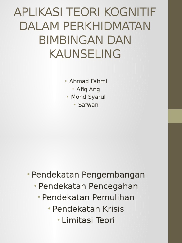 Bimbingan dan konseling adalah upaya dalam memberikan pelayanan bantuan kepada anak agar mampu mandiri dan berkembang secara optimal. Program bimbingan dan konseling di sekolah harus sejalan dengan program pendidikan pada sekolah yang bersangkutan. Perkhidmatan bimbingan dan kaunseling (b&k) sekolah amat penting dewasa ini dalam era negara yang telah mengalami perubahan hasil dari kemajuan dan pembangunan pesat negara. Maksud penilaian ini untuk mengetahui tingkat keberhasilan dan. Psikologi pendidikan dan bimbingan bimbingan konseling fakultas ilmu pendidikan universitas. Tinggalkan komentar go to comments. Dans ce papier, nous presentons une tentative de modification de la surface d'un film de polyacetylene depose sur du mica. Fungsi pengentasan, yaitu pelayanan bimbingan dan konseling yang akan menghasilkan terentaskannya atau teratasinya berbagai permasalahan yang dialami oleh peserta didik. Kata guindance berasal dari kata kerja to guide yang mempunyai arti menunjukan, membimbing, menuntun, ataupun membantu (hallen 2005:2). Bimbingan kelompok dan pengajaran iaitu bimbingan perkembangan yang mengandungi aktiviti terancang dan tersusun yang menggalakkan perkembangan konsep kendiri. Peserta didik mendapatkan nasehat komprehensif tentang karir. Konselor melakukan intervensi (memberikan perlakuan) terhadap konseli supaya memiliki pola berfikir yang sehat, rasional dan. Normah binti zakaria pensyarah kursus bimbingan dan kaunseling cameraman :