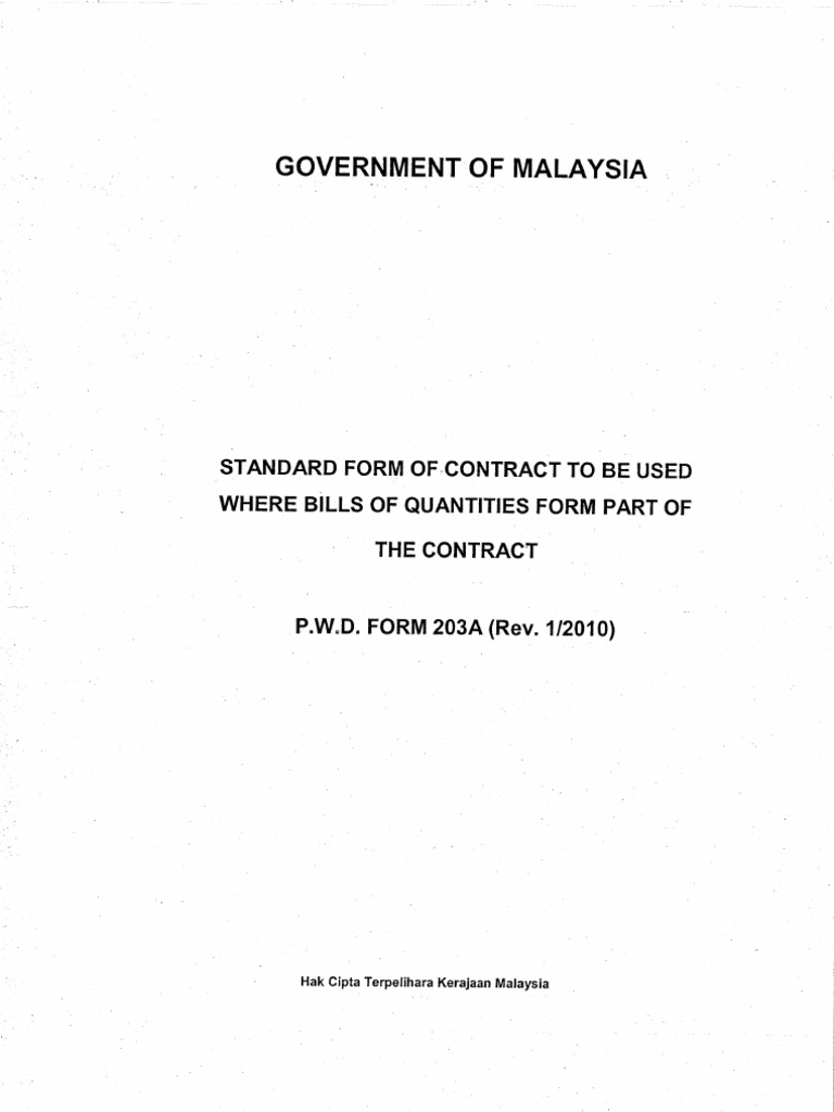 Free unlimited pdf search and download. .(form pwd 203 rev.10/83 for contract based on specification and drawings or form pwd 203a rev.10/83 for contract based on quantities); Government of malaysia standard form of contract to be used where bills of quantities form part of the contract p.w.d. Certificate of practical completion jkr 203w : These are the traditional forms of contract based on drawings and specification (203) or bills of quantities (203a) produced for use in public sector or government.