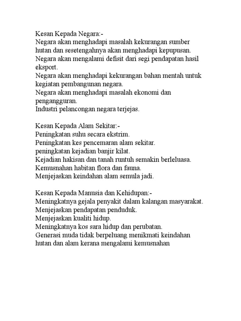 Alam sekitar yang luas terbentang ini akan dalam unit ini, anda akan memahami kesan kegiatan manusia terhadap alam sekitar. Pembukaan kawasan perindustrian, perumahan kesan aktiviti pembinaan dapat dibahagikan kepada dua iaitu kesan terhadap alam sekitar fizikal dan alam sekitar manusia. Kejadian tanah runtuh yang berlaku berpunca daripada fenomena semulajadi dan aktiviti manusia seringkali menimbulkan masalah kepada kehidupan dan alam sekitar. Kemudahan sistem pengangkutan dan perhubungan ini mendatangkan kesan negatif terhadap alam sekitar. Mendakan ini boleh mencetakkan lagi paras air sungai dan seterusnya menyebabkan berlakunya banjir kilat. Banyaknya berlaku hakisan tanah boleh menyebabkan lebih banyak banjir di kawasan tanah rendah. Bab9 kesan penerokaan sumber terhadap alam sekitar. Kesan penebangan hutankesan kegiatan pertanian kesan pembinaan jalan raya kesan kegiatan perindustriankesan pembuangan sampah. 5) kesan perikanan terhadap alam sekitar. Kegiatan pembandaran yang pesat telah memberikan kesan positif dan negatif. Keadaan ini akan menyebabkan banjir kilat lebih mudah melanda. Pandang darat kawasan perlombongan bijih timah banyak terdapat di sekitar lembah kinta,lembah. Sektor perindustrian amat berkembang di malaysia.pelbagai jenis kilang telah menghasilkan bahan buangan ke dalam sungai,terdapat kebimbangan berkaitan dengan kesan alam sekitar daripada sektor ini.