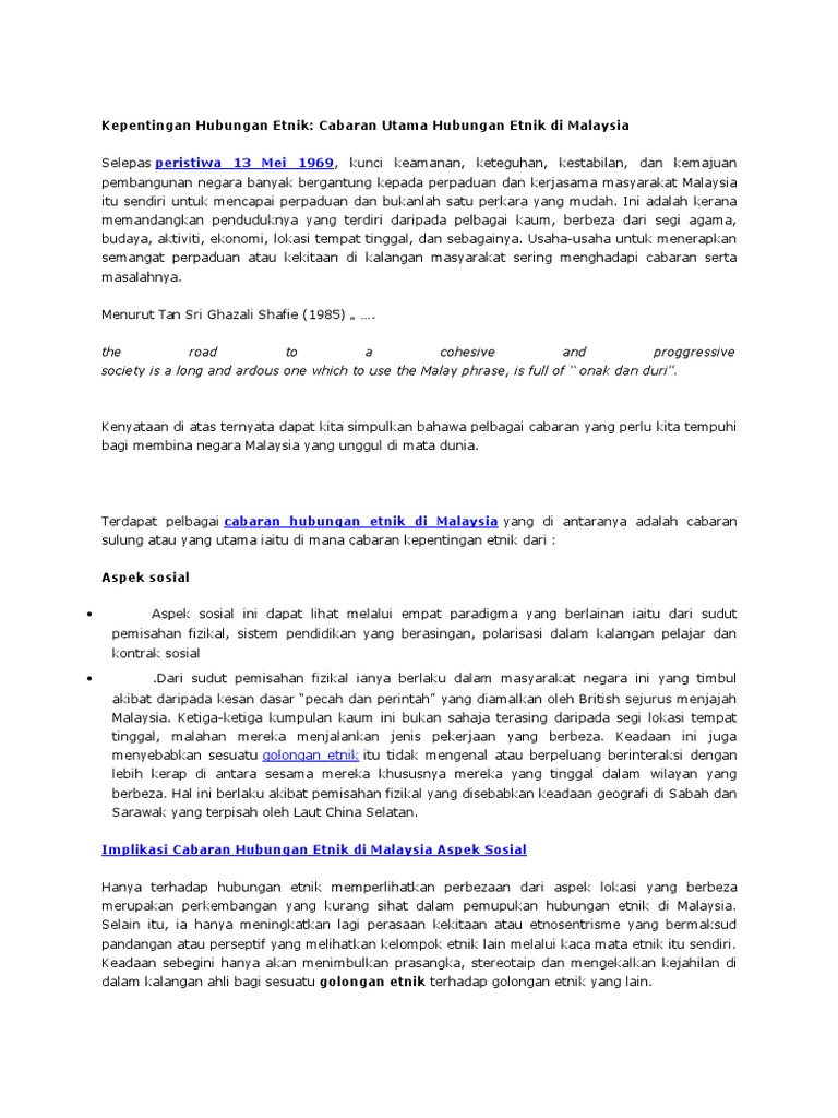 Kepentingan Hubungan Etnik Kesan Peristiwa 13 Mei 1969 from imgv2-1-f.scribdassets.com Dalam menongkah era globalisasi yang kian meningkat dari semasa ke semasa, tanah air kita hampir mencapai kecemerlangan selaras dengan negara maju yang lain bak kata peribahasa melayu, duduk sama rendah berdiri sama tinggi. Dinamika hubungan etnik di malaysia. Bentuk badan, warna dan bentuk rambut, bentuk muka, tengkorak, hidung, mata dan warna mata dan warna kulit. Istilah etnik ini perlu dibezakan dari istilah ras. Sep 29, 2014 · kepentingan hubungan etnik di malaysia. Entdecke die hochwertigen & langlebigen hubtische für alle hebeaufgaben. Kepentingan perpaduan ini boleh dikaitkan kepada 3 elemen utama dalam memastikanpembangunan dan perpaduan di negara kita terus dikekalkan dan dipelihara. Oct 10, 2013 · kepentingan perpaduan dan integrasi dalam konteks hubungan etnik di malaysia kepentingan perpaduan ini boleh dikaitkan kepada 3 elemen utama dalam memastikan pembangunan dan perpaduan di negara kita terus dikekalkan dan dipelihara.