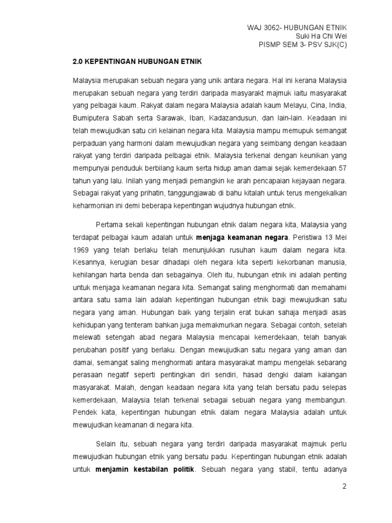 Pdf Hubungan Etnik Di Malaysia from i1.rgstatic.net Sep 29, 2014 · kepentingan hubungan etnik di malaysia. Sehubungan dengan itu, pendidikan merupakan tiang asas dalam proses penyatuan bagi merialisasikan aspirasi negara malaysia bagi mewujudkan dan meningkatkan perpaduan kaum dalam kalangan masyarakat berbilang etnik negara ini. Kepentingan hubungan etnik di malaysia docx antara kepentingan kajian hubungan etnik dalam konteks negara malaysia ialah pertama dari segi ekonomi. More images for kepentingan hubungan etnik di malaysia » Book cheap flights to malaysia. Bentuk badan, warna dan bentuk rambut, bentuk muka, tengkorak, hidung, mata dan warna mata dan warna kulit. Dinamika hubungan etnik di malaysia. Kepentingan perpaduan ini boleh dikaitkan kepada 3 elemen utama dalam memastikanpembangunan dan perpaduan di negara kita terus dikekalkan dan dipelihara.